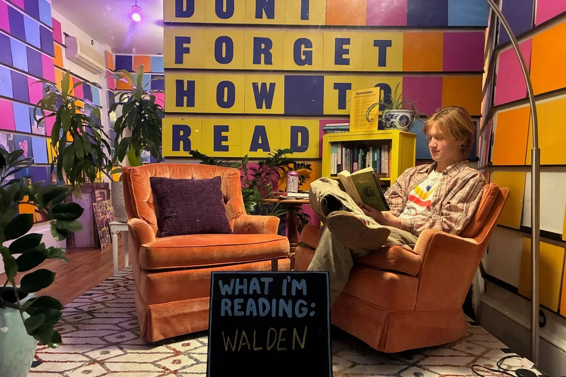 Worried that people are indeed, forgetting how to read, Modern Art set up a cozy, comfortable, highly visible nook in our front window to remind people. Throughout January 2026, passers by were invited to be a part of this interactive public service announcement by stopping in to read in the nook for a little while. And while they read, other passers by can look in the window, see how pleasant it looks, and then think to themselves wow, reading is a great way to spend some time. Check it out here:
