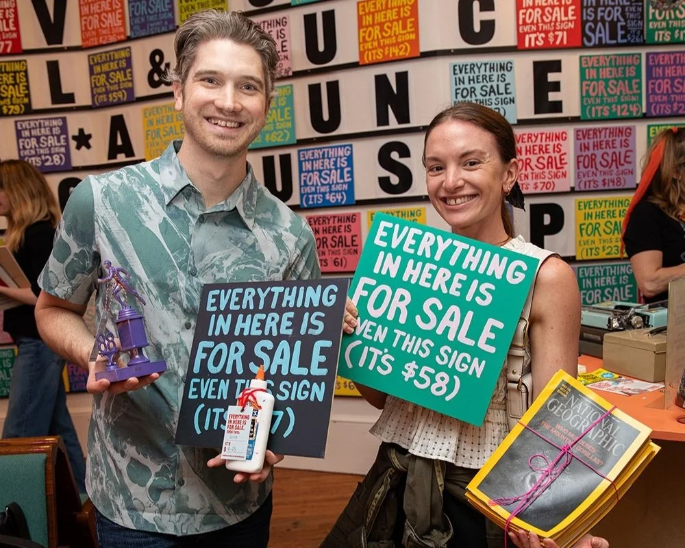 But that’s not all: not only the signs are for sale, EVERYTHING in the studio is for sale. The furniture, the pens, the books. The paintbrushes, the cleaning supplies, the curtains. Everything that Modern Art has gathered and created for the past 12 years— all can be yours in exchange for some cold hard cash (or credit, or check or venmo— whatever your monetary style.)